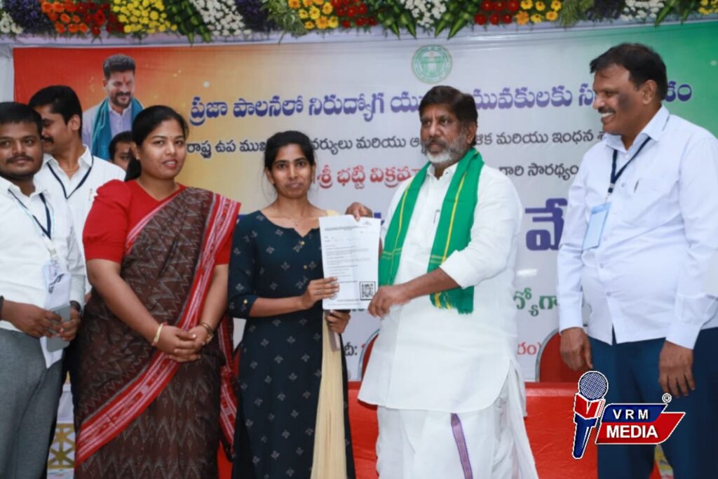 5 వేల మంది నిరుద్యోగులకు ఉపాధి కల్పించే లక్ష్యంతో మధిర పట్టణంలోని రెడ్డి గార్డెన్స్ లో సోమవారం ఏర్పాటు చేసిన మెగా జాబ్ మేళాను రాష్ట్ర ఉప ముఖ్యమంత్రి, ఆర్థిక, ఇంధన శాఖల మంత్రివర్యులు భట్టి విక్రమార్క మల్లు ప్రారంభించారు.
