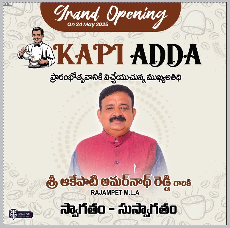 టీ స్టాల్ ప్రారంభం రాజంపేట ఎమ్మెల్యే ఆకేపాడు అమర్నాథ్ రెడ్డి రాజంపేట టౌన్ గ్రామ ప్రజలకు అందుబాటులో ఆదర్శమంతుడుగా మన నియోజకవర్గంలో ఎలాంటి విభేదాలు లేకుండా గ్రామ ప్రజలకు న్యాయం చమకూరుస్తూ గ్రామ అభివృద్ధికి పాటుపడుతూ యుక్తిగా రాజంపేట నియోజకవర్గంలో అభివృద్ధి కార్యక్రమాలు నెరవేరుస్తూ మన ఆకేపాడు అమర్నాథ్ రెడ్డి నిండు నూరేళ్లు వర్ధిల్లాలని కోరుకుంటూ గ్రామ ప్రజలు రాజంపేట నియోజకవర్గం సభ్యులు వైయస్సార్ సిపి జగన్మోహన్ రెడ్డి ఆదర్శంగా నిలవాలని కోరుకుంటూ రాజంపేట ఎమ్మెల్యే ఆకేపాడు అమర్నాథరెడ్డి