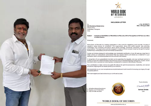 భారతీయ సినిమాలో హీరోగా హీరోగా చేసిన విశేష కృషికి కృషికి గుర్తింపుగా గుర్తింపుగా, UK లోని వరల్డ్ బుక్ ఆఫ్ రికార్డ్స్ గోల్డ్ ఎడిషన్‌లో చేర్చి చేర్చి సత్కరిస్తున్నారు. ఈ సత్కారం ఆగస్టు 30 న హైదరాబాద్‌లో.