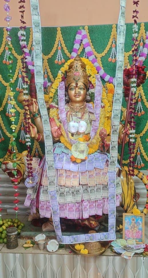 దేవి శరన్నవరాత్రి మహోత్సవాల్లో భాగంగా ఐదో రోజు శుక్రవారం జగన్మాత ధనలక్ష్మీ అలంకరణలతో భక్తులకు దర్శనమిచ్చింది.ప్రత్తిపాడు మండలం రౌతుపాలెం గ్రామంలో ఆలయ ధర్మకర్త జానకి శివబాబు ఆధ్వర్యంలో పెద్దాపురం మండలం ఉలిమేశ్వరం వాస్తవ్యులు గల్లా వీర వెంకటరావు,వారి సతీమణి పుష్ప, కుమారుడు యశ్వంత్ వీర దుర్గ సహకారంతో నగదు నోట్లతో ధగ ధగ మెరిసేలా అలంకరించారు.ఈ సందర్బంగా మహిళలు ప్రత్యేక పూజలు,కుంకుమ పూజలు చేశారు.ఆగమ సంప్రదాయానికి అనుగుణంగా అమ్మవారు అలంకృతురాలై భక్తుల పూజలు అందుకుంది.ధనలక్ష్మీ అలంకరణలతో శోభిల్లిన అమ్మవారిని భక్తజనం దర్శించుకుని దేవీ అనుగ్రహం పొందారు.అమ్మవారిని కరెన్సీ నోట్లతో అలంకరించిన గల్లా వీర వెంకటరావు కుటుంబ సభ్యులను ఆలయ ధర్మకర్త జానకి శివ బాబు అభినందించారు.