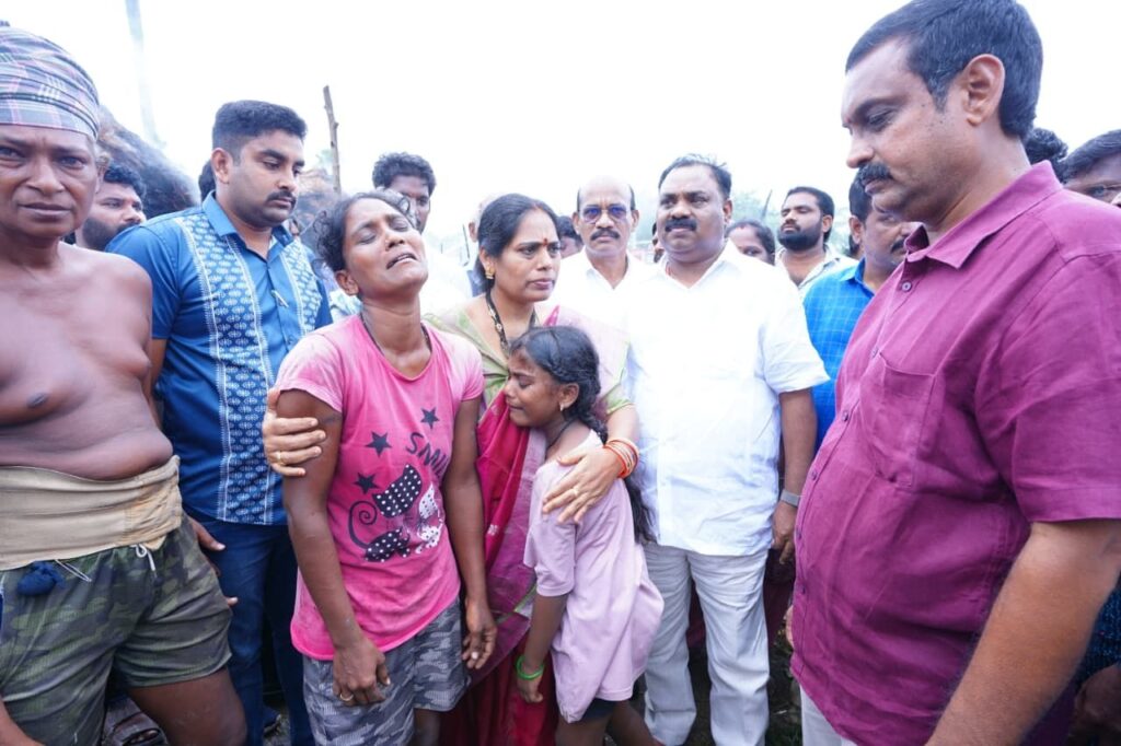 దోసకాయలపల్లి లో జరిగిన అగ్ని ప్రమాదంలో మేకల మందను మేపుకుంటూ.. కుటుంబాన్ని పోషించుకుంటున్న జుత్తుగా సుబ్రహ్మణ్యం సర్వం కోల్పోయాడు. ఈ విషయం తెలుసుకున్న వెంటనే ఎమ్మెల్యే శ్రీ బత్తుల బలరామకృష్ణ గారు, నా సేన కోసం నా వంతు రాష్ట్ర కోఆర్డినేటర్ శ్రీమతి బత్తుల వెంకటలక్ష్మి గారు హుటాహుటిన సంఘటన స్థలానికి వెళ్లి బాధిత కుటుంబాన్ని పరామర్శించారు. సుమారు 40 మేకలతో పాటు ఇల్లు, గడ్డివాములు, సర్వం అగ్నికి ఆహుతి అయ్యాయి. ఈ దృశ్యాలు చూసి చలించి పోయిన ఎమ్మెల్యే బత్తుల గారు తన సొంత డబ్బులు లక్ష రూపాయలను బాధిత కుటుంబానికి అందిస్తానని తెలిపారు. వారికి ధైర్యం చెప్పడంతో పాటు అగ్ని ప్రమాదం వల్ల సంభవించిన నష్టాన్ని అధికారుల దృష్టికి తీసుకువెళ్లి తగిన నష్టపరిహారం అందేలా చర్యలు తీసుకుంటానని పేర్కొన్నారు. అలాగే మేకలను కొనుగోలు చేయడానికి అవసరమైన రుణాన్ని మంజూరు చేయించేందుకు కృషి చేస్తానన్నారు. బాధిత కుటుంబాన్ని అన్ని విధాల ఆదుకుంటామని ఎమ్మెల్యే శ్రీ”బత్తుల బలరామకృష్ణ” గారి సతీమణి నా సేన నా వంతు రాష్ట్ర కో-ఆర్డినేటర్శ్రీమతి “బత్తుల వెంకటలక్ష్మి” గారు తెలిపారు.