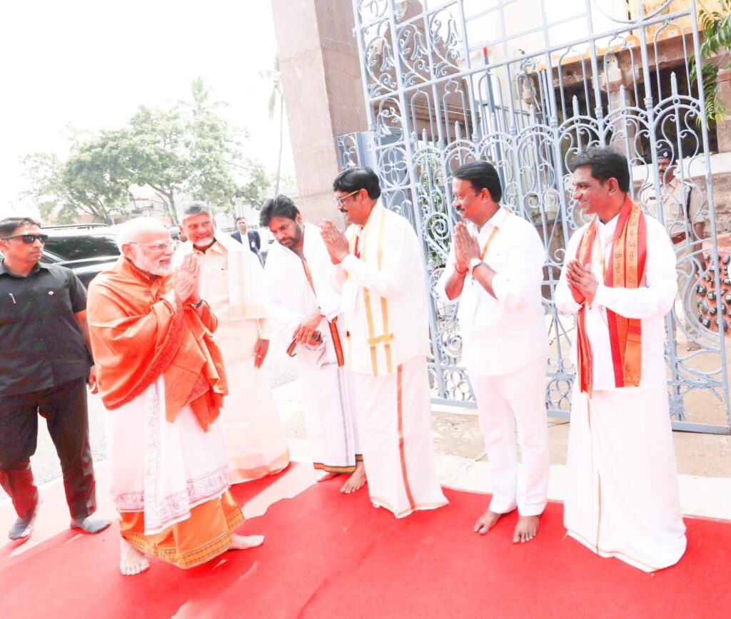 ఈనెల 16వ తారీఖున శ్రీశైల క్షేత్రానికి శ్రీశైల భ్రమరాంబ మల్లికార్జున స్వామివార్ల దర్శనార్థం శ్రీశైల క్షేత్రానికి దేశ ప్రధానమంత్రి నరేంద్ర మోడీ విచ్చేసిన సందర్భంగా ఆలయ చైర్మన్ గా పోతు గుంట రమేష్ నాయుడు రాష్ట్ర ముఖ్యమంత్రి చంద్రబాబు నాయుడు రాష్ట్ర ఉపముఖ్యమంత్రి పవన్ కళ్యాణ్ రాష్ట్ర దేవాదాయ శాఖ మంత్రి ఆనం రామనారాయణరెడ్డి స్థానిక ఎమ్మెల్యే బుడ్డా రాజశేఖర్ రెడ్డి గార్లతో కలిసి వారికి స్వాగతం పలకడం జరిగింది అనంతరం వారు స్వామివారిలను అమ్మవార్లను ప్రత్యేక అభిషేకం కుంకుమార్చన వేద పండితుల ఆశీర్వాదం తీసుకోవడం జరిగింది అనంతరం వారు శివాజీ స్ఫూర్తి కేంద్రాన్ని సందర్శించడం జరిగింది అత్యంత ప్రతిష్టాత్మకంగా శ్రీశైలం క్షేత్రం ఎంతో శోభాయమానంగా నరేంద్ర మోడీ గారికి ఘనస్వాగతం పలకడం జరిగింది. ఈ సందర్భంగా శ్రీశైలం ధర్మకర్తల మండలి చైర్మన్ పోతు గుంట రమేష్ నాయుడు మాట్లాడుతూ దేశ ప్రధానమంత్రి మొట్టమొదటిసారిగా జ్యోతిర్లింగము శక్తిపీఠము ఒకే చోట ఉన్న క్షేత్రము మరియు నిత్యము చండీ హోమం జరిగే క్షేత్రము భూమండలానికి నాభి స్థానంలో ఉన్నటువంటి క్షేత్రము ఈ క్షేత్రానికి నరేంద్ర మోడీ రాకతో మరింత ప్రాచుర్యంలోకి వస్తుంది రాబోయే రోజుల్లో మరింత ఈ ప్రాంతం అభివృద్ధి చెంది భక్తులకు ఇంకా మెరుగైన సౌకర్యాలు కల్పించబోతున్నామని ఈ సందర్భంగా వారు తెలియజేశారు