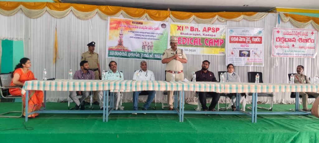 రక్తదానం చేయండి ప్రాణదాతలు కండి 11వ పోలీస్ పటాలయం కమాండెంట్ కె ఆనంద రెడ్డి తెలిపారు పోలీస్ అమరవీరుల వారోత్సవాల్లో భాగంగా బెటాలియన్ లోని కళ్యాణమండపము నందు బ్లడ్ డొనేషన్ క్యాంపు మరియు ఉచిత మెగా మెడికల్ క్యాంపు నిర్వహించారు కార్యక్రమానికి, డాక్టర్ నవీద్ అహ్మద్ డాక్టర్ రామనాథం డాక్టర్ జయ ప్రకాష్ డాక్టర్ ప్రబంజ ప్రభంజన్ డాక్టర్ శ్రావిక హాజరు అయ్యి వారియొక్క సేవలను అందించారు మెడికల్ క్యాంపు నందు దాదాపు 273 మంది వరకు ఆఫీసర్స్, మెన్ యొక్క కుటుంబ సభ్యులు మరియు బెటాలియన్ చుట్టూ పక్కల గామ ప్రజలకి చిన్నపిల్లకు, వృద్ధులకు మరియు వచ్చిన వారందరికీ వైద్య పరీక్షలుచేసి ఉచిత మందులు పంపిణి చేసారు అలాగే బ్లడ్ డొనేషన్ కార్యక్రమం జరిగినది ఈ కార్యక్రమంలో పోలీస్ సిబ్బంది 19 మంది బ్లడ్ ఇవ్వటం జరిగినది ఈ కార్యక్రమంలో అసిస్టెంట్ కమాండెంట్ డి.ఎస్.పి శ్రీ కె వెంకట రెడ్డి యూనిట్ మెడికల్ ఆఫీసర్ శ్రీమతి దివ్య రాణి ఆర్ఐ లు ఆర్ఎస్ఐలు, ఏఆర్ఎస్ఐ లు మరియు సిబ్బంది యూనిట్ హాస్పిటల్ సిబ్బంది ఈ కార్యక్రమంలో పాల్గొన్నారు