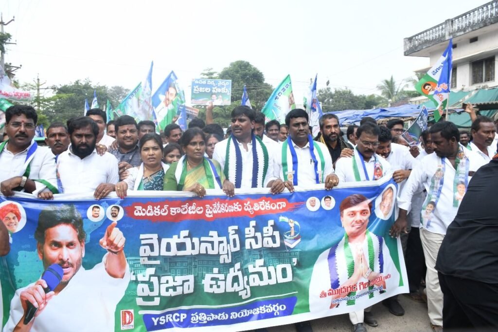 మెడికల్ కళాశాల ప్రైవేటీకరణను ప్రభుత్వం తక్షణమే ఉపసంహరించుకోవాలని వైసీపీ కో ఆర్టినేటర్ ముద్రగడ గిరి బాబు ప్రభుత్వాన్ని డిమాండ్ చేశారు. రాష్ట్ర ప్రభుత్వం మెడికల్ కాలేజీలు ప్రైవేటీకరణ చేయడాన్ని నిరసిస్తూ బుధవారం ప్రత్తిపాడులో వైఎస్ఆర్సిపి శ్రేణులు ప్రజా ఉద్యమం చేపట్టాయి. నియోజకవర్గ కోఆర్డినేటర్ ముద్రగడ గిరిబాబు ఆధ్వర్యంలో నలుమూలల నుండి వచ్చిన పార్టీ నాయకులు కార్యకర్తలు అభిమానులతో ర్యాలీ కొనసాగింది. స్థానిక లయన్స్ క్లబ్ కళ్యాణ మండపం నుండి ప్రారంభమైన ర్యాలీ అల్లూరి జంక్షన్లో బయటయించారు. వైద్య కళాశాలల ప్రైవేటీకరణను వ్యతిరేకంగా నినాదాలు చేశారు. ఈ బైఠాయింపు వల్ల ట్రాఫిక్ స్తంభించింది. అనంతరం ర్యాలీగా తాసిల్దార్ కార్యాలయానికి చేరుకుని ధర్నా నిర్వహించారు. ధర్నా అనంతరం తాసిల్దార్ కు వినతిపత్రం అందజేశారు. ఈ సందర్భంగా గిరిబాబు మాట్లాడుతూ గత వైసిపి ప్రభుత్వం రాష్ట్రానికి 17 మెడికల్ కాలేజీలు తీసుకువస్తే చంద్రబాబు ప్రభుత్వం ప్రవేట్ వ్యక్తులకు దారా దత్తం చేసిందని దుయ్యబట్టారు. చంద్రబాబు ప్రభుత్వంలో ఒక్క మెడికల్ కాలేజ్ కూడా తీసుకురాలేదని విమర్శించారు. మెడికల్ కళాశాలల ప్రైవేటీకరణనుమెడికల్ కళాశాలల ప్రైవేటీకరణను నిలుపుదల చేసే వరకు ఉద్యమం కొనసాగుతుందని గిరిబాబు అన్నారు. చంద్రబాబు పాలనంత అప్పులతో పరిపాలిస్తున్నారని ఆరు నెలల్లో 60 వేల కోట్లు అప్పులు చేసి ఏమి అభివృద్ధి చేశారని ప్రశ్నించారు. అభివృద్ధి చేస్తున్నామని ప్రచారం తప్ప ఎక్కడ అభివృద్ధి చేయకుండా ప్రజలను మోసం చేస్తున్నారని మండిపడ్డారు. ఈ కార్యక్రమంలో మాజీ ఎమ్మెల్సీ అంగూరి లక్ష్మీ శివకుమారి, జడ్పిటిసిలు బెహరా రాజరాజేశ్వరి, గొల్లు దివానం, ఎంపీపీ గోళ్ళ క్రాంతి సుధాకర్, బెహరా దొరబాబు, ఒమ్మి రఘురాం, రామిశెట్టి నాని, గుడాల వెంకటరత్నం, బదిరెడ్డి గోవింద్, సుంకర రాంబాబు, దలే చిట్టీబాబు తదితరులు పాల్గొన్నారు.