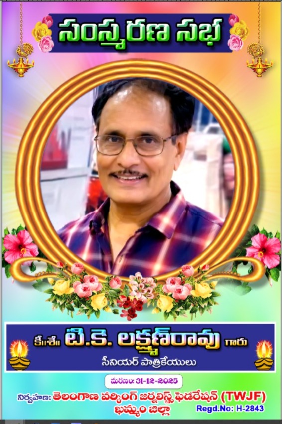 జర్నలిస్టుల గౌరవం,హక్కులు,సంక్షేమం కోసం జీవితాంతం పోరాడిన సీనియర్ పాత్రికేయుడు,ఉమ్మడి ఆంధ్రప్రదేశ్ వర్కింగ్ జర్నలిస్ట్స్ ఫెడరేషన్ వ్యవస్థాపక సభ్యులు టీ.కే. లక్ష్మణ రావు సంస్మరణ సభను తెలంగాణ వర్కింగ్ జర్నలిస్ట్స్ ఫెడరేషన్ (టిడబ్ల్యూజేఎఫ్ – హెచ్-2843) ఖమ్మం జిల్లా కమిటీ ఆధ్వర్యంలో శనివారం స్థానిక ప్రెస్ క్లబ్ లో నిర్వహించారు.ఈ కార్యక్రమానికి ప్రెస్ క్లబ్ అధ్యక్షుడు అంతోటి శ్రీనివాస్ అధ్యక్షత వహించారు.సభ ప్రారంభంలో లక్ష్మణ రావు చిత్రపటానికి పూలమాలలు వేసి ఘన నివాళులు అర్పించి, ఆయన ఆత్మశాంతి కోసం రెండు నిమిషాలు మౌనం పాటించారు.ఈ సందర్భంగా టిడబ్ల్యూజేఎఫ్ ఖమ్మం జిల్లా అధ్యక్షుడు టి.సంతోష్ చక్రవర్తి, కార్యదర్శి నానబాల రామకృష్ణ లు మాట్లాడుతూ, లక్ష్మణ రావు మృతి జర్నలిస్టు సమాజానికి తీరని లోటని అన్నారు. జర్నలిస్టుల సమస్యల పరిష్కారం, హక్కుల సాధన కోసం ఆయన చేసిన సేవలు చిరస్మరణీయమని, ఆయన పోరాట పటిమ టిడబ్ల్యూజేఎఫ్కు ఎప్పటికీ మార్గదర్శకమని పేర్కొన్నారు.ఉదయం, వార్త, సాక్షి వంటి ప్రధాన పత్రికల్లో పనిచేసిన సీనియర్ పాత్రికేయుడిగా లక్ష్మణ రావు చిన్న–పెద్ద తేడా లేకుండా అందరితో స్నేహంగా మెలిగేవారని వక్తలు గుర్తు చేశారు.తెలుగు భాషపై అపారమైన పట్టు, వృత్తిలో ఎంత ఒత్తిడి ఉన్నా చిరునవ్వుతో వ్యవహరించే వ్యక్తిత్వం ఆయన ప్రత్యేకతలని కొనియాడారు.జర్నలిస్ట్స్ ఫెడరేషన్ స్థాపనలో ఆయన పోషించిన పాత్ర రాబోయే తరం జర్నలిస్టులకు ఆదర్శమని తెలిపారు.ఈ సంతాపసభలో టిడబ్ల్యూజేఎఫ్ జిల్లా సహాయ కార్యదర్శి కుంభం రవికుమార్, టీబీజేఏ జిల్లా అధ్యక్షుడు వందనపు సామ్రాట్ గుప్తా, వీడియో గ్రాఫర్స్ జిల్లా అధ్యక్షుడు అమరబోయిన ఉపేందర్, జిల్లా కోశాధికారి అర్వపల్లి నగేష్, టిడబ్ల్యూజేఎఫ్ నగర అధ్యక్షుడు గంటెల కుమార్,టీబీజేఏ నగర అధ్యక్షుడు ఎలుగోటి వెంకట్, ప్రెస్ క్లబ్ కోశాధికారి కొదుమూరి భద్రయ్య, నగర కార్యవర్గ సభ్యుడు చిన్నంశెట్టి రాంబాబు తదితరులు పాల్గొని టీ.కే. లక్ష్మణ రావుకు ఘనంగా నివాళులర్పించారు.