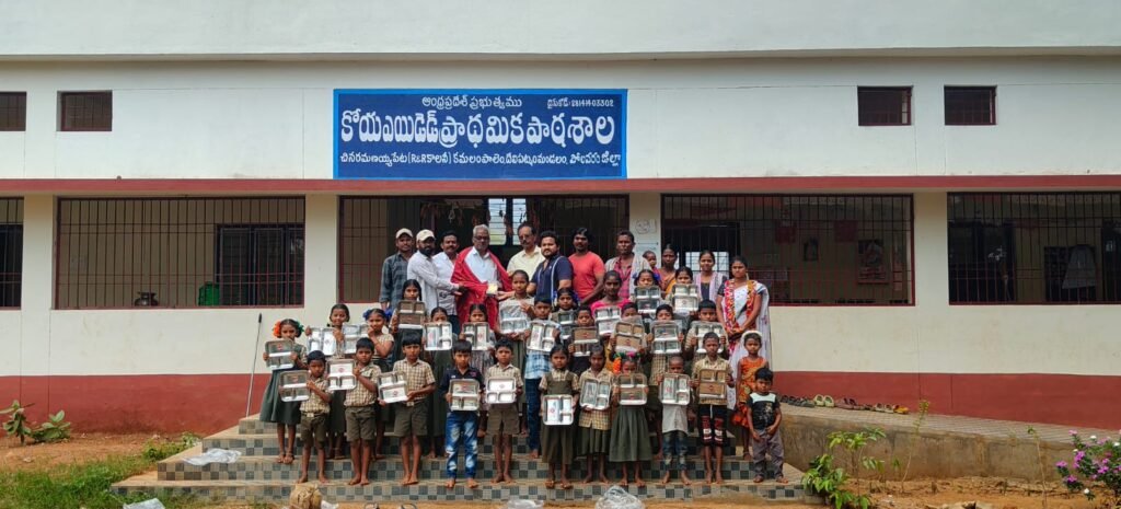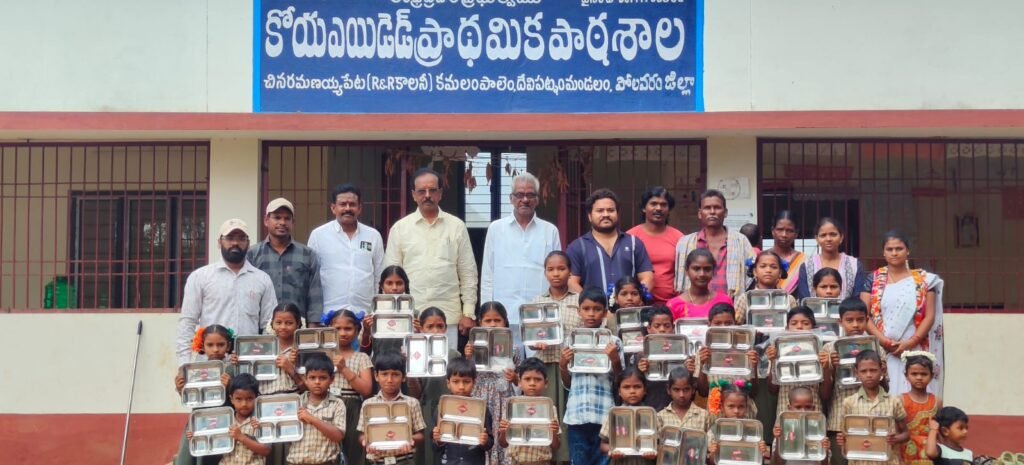 పోలవరం జిల్లా దేవీపట్నం మండలం లో చిన్న రమణయ్యపేట R&R కాలనీ కమలం పాలెం కు సంబంధించిన , కోయ ఎయిడెడ్ ప్రాథమిక పాఠశాల నందు ఈరోజు స్కూల్లో ఉన్నటువంటి పిల్లలకు మధ్యాహ్నం భోజనం చేయడానికి ప్లేట్స్ ను గోకవరం మండలం గోకవరం గ్రామానికి చెందిన ఇనకోటి పెద్దలయ్య, ఇనకోటి బాపన దొర,పిల్లలకు 40 ప్లేట్స్ మరియు వాటర్ టిన్ ఇవ్వడం జరిగింది. ఈ కార్యక్రమంలో ముఖ్య అతిథులుగా దేవీపట్నం మండలం ఎంఈఓ అయినటువంటి త్రిమూర్తులు, SMC చైర్మన్ శంకర్ , వైస్ చైర్మన్ పొడుగు పద్మ , గ్రామంలో ఉన్నటువంటి పీసా నాయకులు దొరబాబు, రాజు, గ్రామంలో యూత్ లీడర్స్ , కారం దుర్గా ప్రసాద్, పుసం సురేష్,పొడుగు రమణ , స్కూల్ HM కరిబండి రాజు, తోటి ఉపాధ్యాయులు పాల్గొనడం జరిగింది.. అలాగే భోజనం ప్లేట్స్ ఇచ్చిన దాతలను స్కూలు యాజమాన్యం వారు గ్రామస్తులు, తల్లిదండ్రులు, ఘనంగా సన్మానించడం జరిగింది.