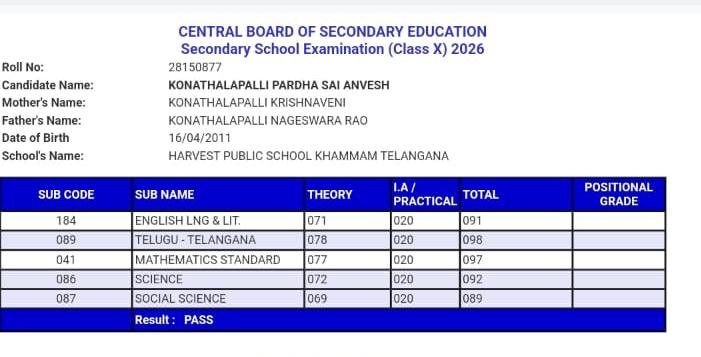 ఖమ్మం జిల్లా బోనకల్కు చెందిన కొణతాలపల్లి పార్ధ సాయి అన్వేష్ సీబీఎస్సీ పదో తరగతి ఫలితాలలో మెరుగైన ప్రతిభ కనబర్చాడు. ఖమ్మంలోని హార్వెస్ట్ స్కూల్లో చదువుతున్న అతడు 500 మార్కులకు గాను 467 మార్కులు సాధించాడు. అన్వేష్ తల్లిదండ్రులు కొణతాలపల్లి నాగేశ్వరరావు, కృష్ణవేణి. ఫలితాల అనంతరం ఆనందం వ్యక్తం చేసిన అన్వేష్, మంచి ఫలితాలు సాధించడంలో స్కూల్ యాజమాన్యం, తల్లిదండ్రుల సహకారం ఎంతో కీలకమని తెలిపాడు. విద్యార్థి సాధించిన విజయానికి తల్లిదండ్రులు, పాఠశాల యాజమాన్యం అభినందనలు తెలిపారు. ఈ సందర్భంగా తోటి మిత్రులు, బంధువులతో కలిసి స్వీట్లు పంచుకుని సంబరాలు జరుపుకున్నారు.